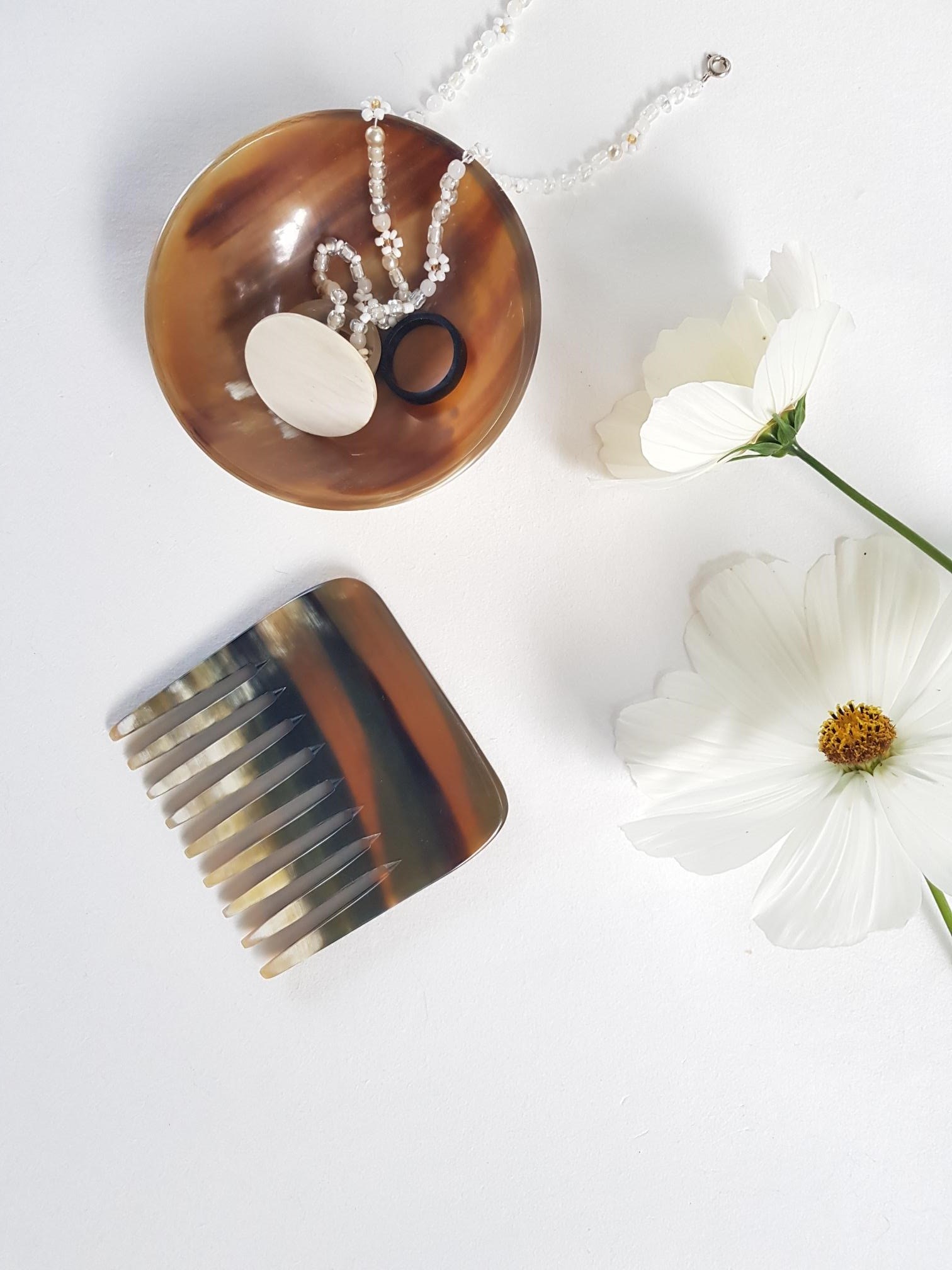 Comb Square is one of our most popular combs – precisely because it combines beauty, strength, and gentleness. Horn and hair are made from the same material, keratin, which makes the comb especially gentle and healthy for the hair. It’s perfect for combing through both curly and straight hair, and thanks to its solid quality, it can be kept in a bag without the teeth getting damaged.